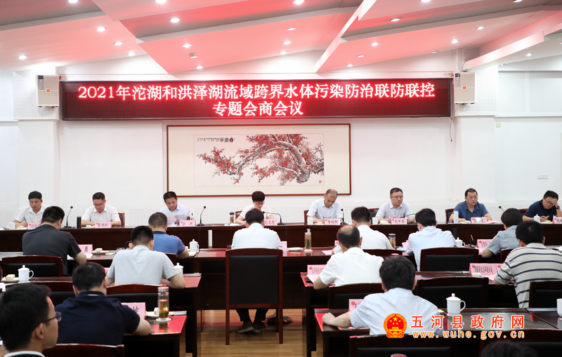 根据《关于做好2021年沱湖和洪泽湖流域跨界水体污染防治联防联控工作的通知》、蚌宿两市签订《关于跨界河流水污染联防联控合作的协议》, 6月16日, 2021年沱湖和洪泽湖流域跨界水体污染防治联防联控专题会商会议在五河召开。县委副书记、代县长刘中原到会致辞。