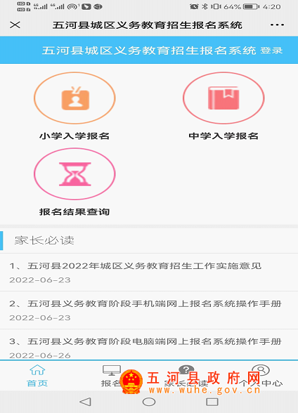 2、进入手机端报名界面,家长可查看报名必读、填写报名材料、查询报名结果: