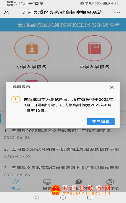 3.1、小学入学报名:该系统目前为测试阶段,小学阶段正式报名时间段为2022年8月1日-8月12日,所有数据将于2022年8月1日零时清空。