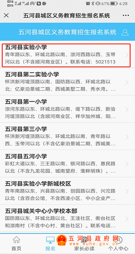 3.4、根据所属学区,选择学校填报报名信息,进行报名: