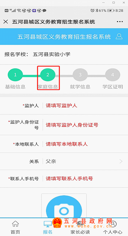 3.6、填写家庭信息。填写监护人、本地联系人、父母身份证、家庭详细地址等信息。系统具备身份证号、手机号自动校验和身份证图片识别功能,拍照上传身份证后,可自动识别姓名、身份证号等信息。家庭信息如下: