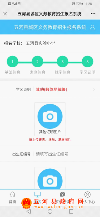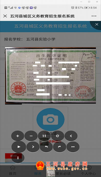 3.8.1、城区户籍:按要求填写出生证、户籍等信息,提交资料可完成报名。包含城关镇城区和头铺镇金岗村、冯刘村、大方村、花木王村、孙坪村等五个行政村户籍适龄儿童入学。系统提供示例图片,供家长知晓上传图片类型及要求。
