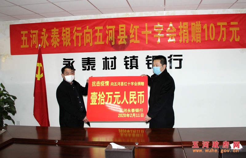 2月11日,五河永泰村镇银行向五河县红十字会捐款10万元,全力支持抗击疫情,以实际行动彰显五河县域银行的责任担当,为支持抗击疫情贡献出自己的一份力量。