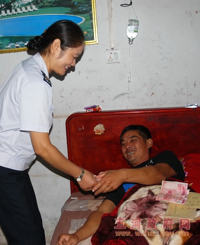 近日,县地税局组织学雷锋志愿者小分队到头铺镇东凌村看望慰问奋不顾身、勇救落水少女、被尖利物体划断脚筋的英雄凌以理,给他送去了2000元的慰问金。