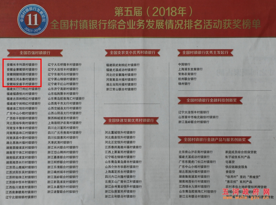 9月18日至20日,由中国县镇经济交流促进会、金融时报社等举办的第十一届中国村镇银行发展论坛在湖北恩施隆重举行。论坛公布了2018年全国村镇银行综合业务发展情况排名,五河县永泰村镇银行以综合实力、先进经营管理、特色产品以及优质服务上的卓越成效晋级“全国百强村镇银行”行列,获此殊荣的全国共55家,安徽省有5家,五河县永泰村镇银行为蚌埠地区唯一1家。