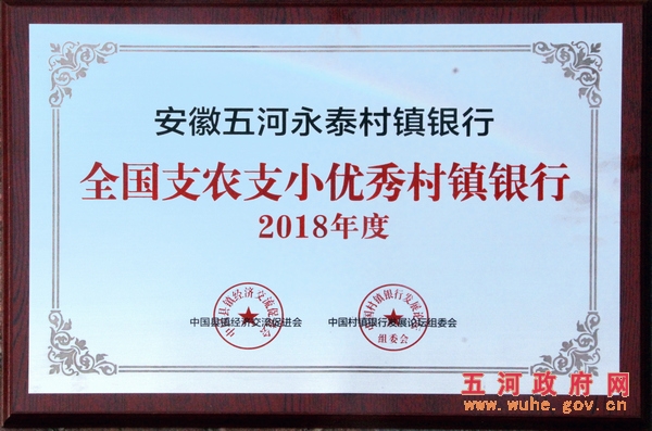 安徽五河永泰村镇银行获评“2018年度全国支农支小优秀村镇银行”