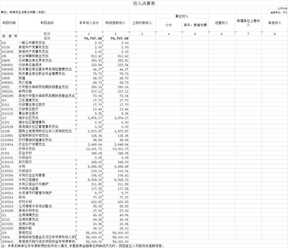 2023年度财政拨款收入总计70757.08万元(含年初财政拨款结转和结余),支出总计70757.08万元(含年末财政拨款结转和结余)。与2022年相比,财政拨款收、支总计各增加47940.86万元,增长210.12%,主要原因:一是增加皖北地区引调水项目债券资金;二是增加中小型水利改造提升项目专项债资金。