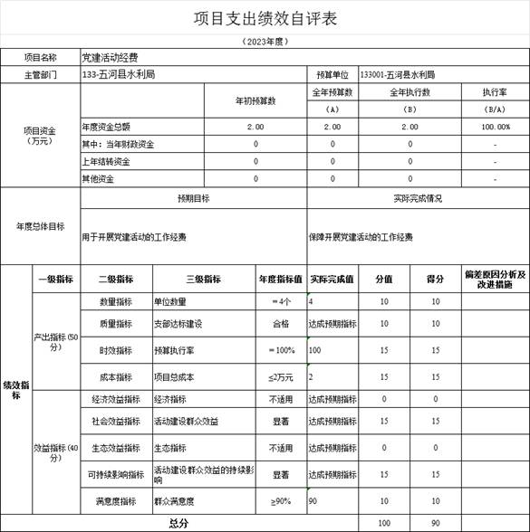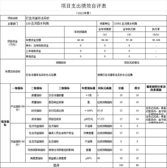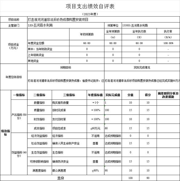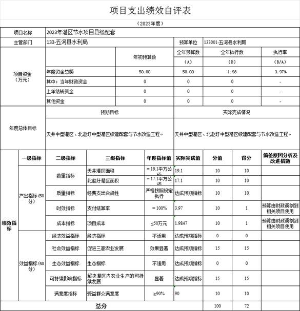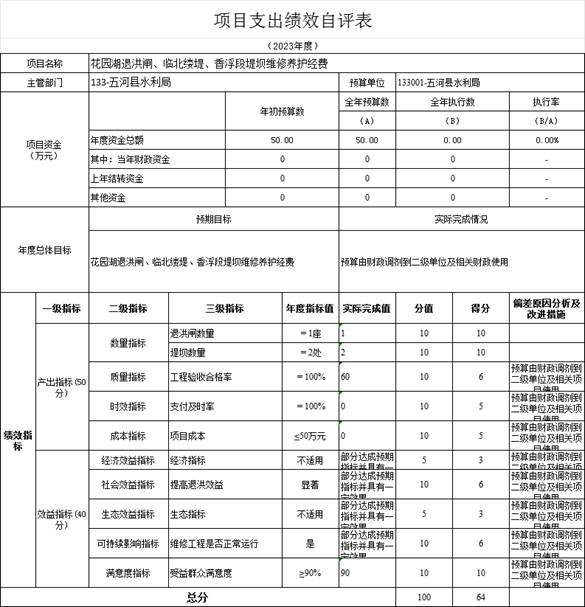 国有涵闸、灌溉泵站管养经费项目绩效自评综述:根据年初设定的绩效目标,项目绩效自评得分为90分。全年预算数为20万元,执行数为20万元,完成预算的100%。项目绩效目标完成情况:一是保障涵闸、泵站故障处理及时,设备正常运行;二是发挥防洪和灌溉效益。 发现的主要问题及原因:无。下一步改进措施:一是高度重视绩效评价结果的应用工作,充分发挥绩效评价以评促管效能,积极探索和建立一套与预算管理相结合、多渠道应用评价结果的有效机制,努力提高绩效意识和财政资金使用效益;二是要结合评价结果,对被评价项目的绩效情况加以综合分析,建立评价结果在部门预算安排中的激励与约束机制,逐步发挥绩效评价工作的应有作用。