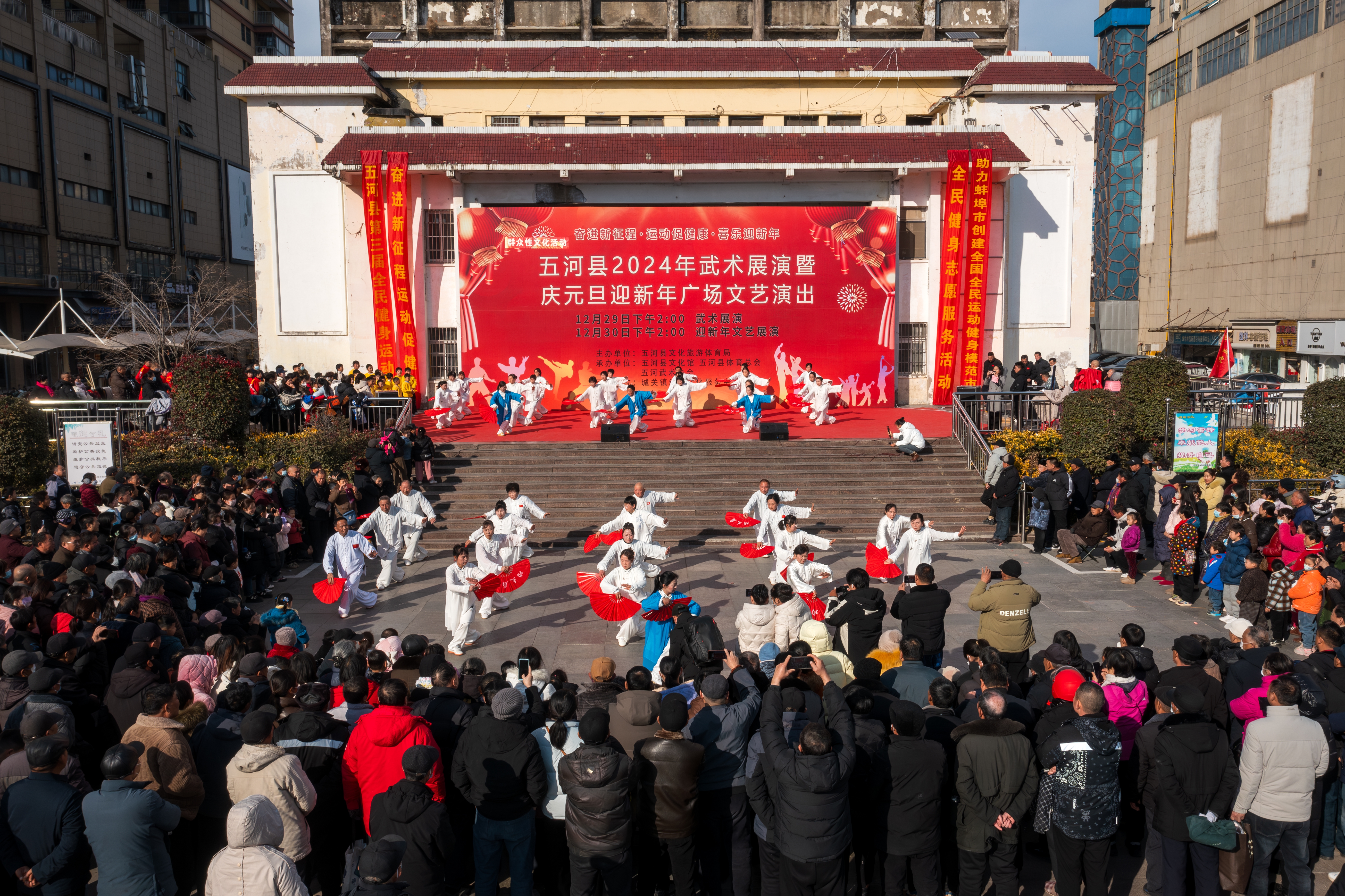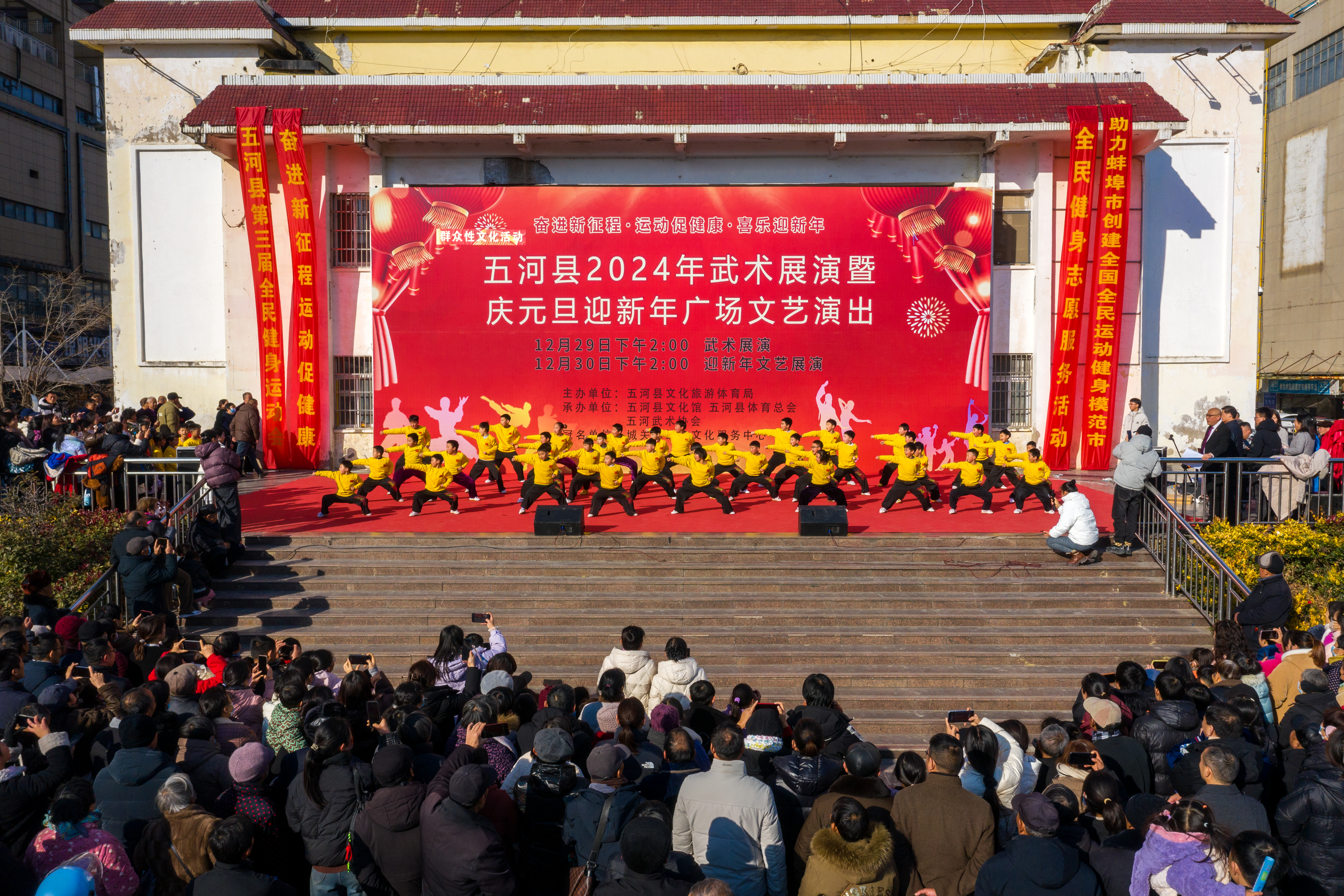 2024年12月29日,由五河县文化旅游体育局主办,五河县文化馆、五河县武术协会承办的五河县2024年武术展演暨庆元旦迎新年广场文艺演出在青年圩广场隆重举行,来自县武术协会各晨练点、辅导站、武术馆校的两百多名武术爱好者参加了本次展演活动。