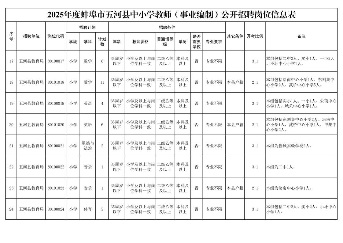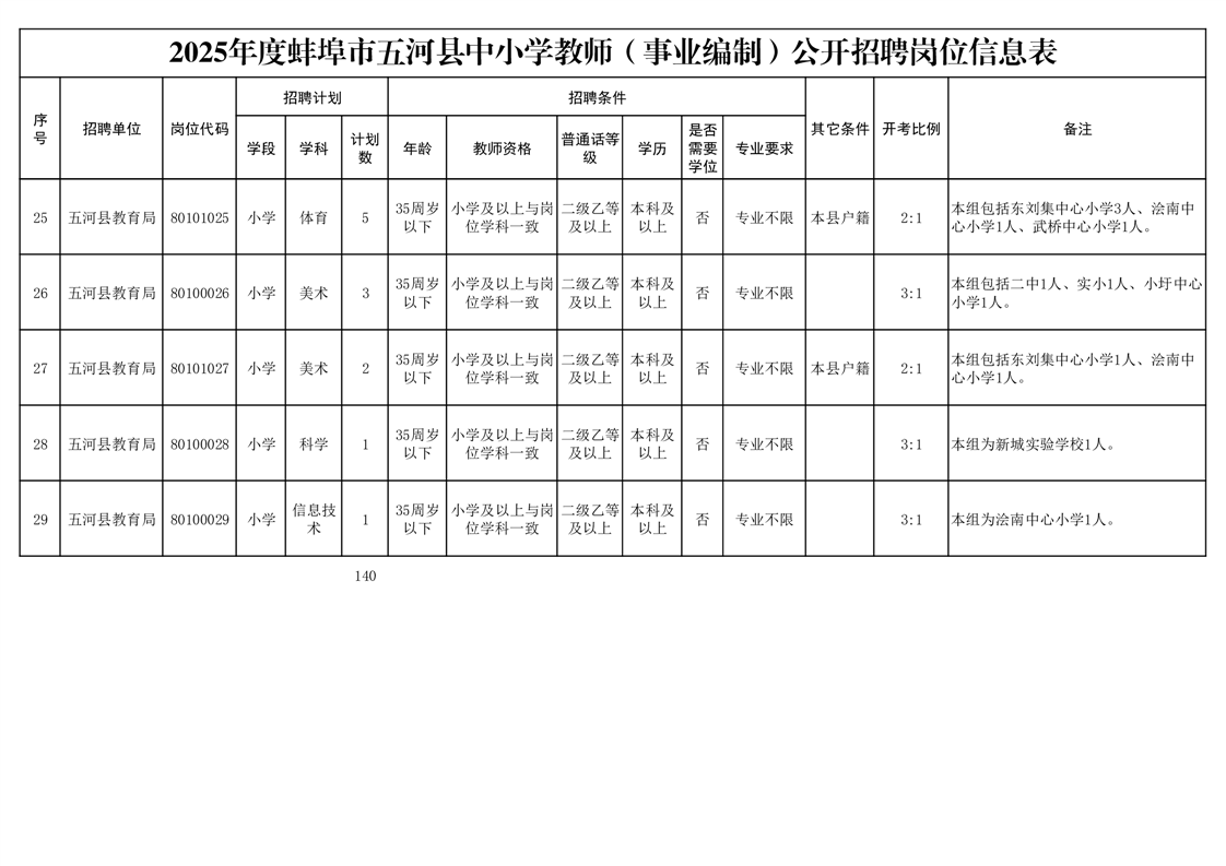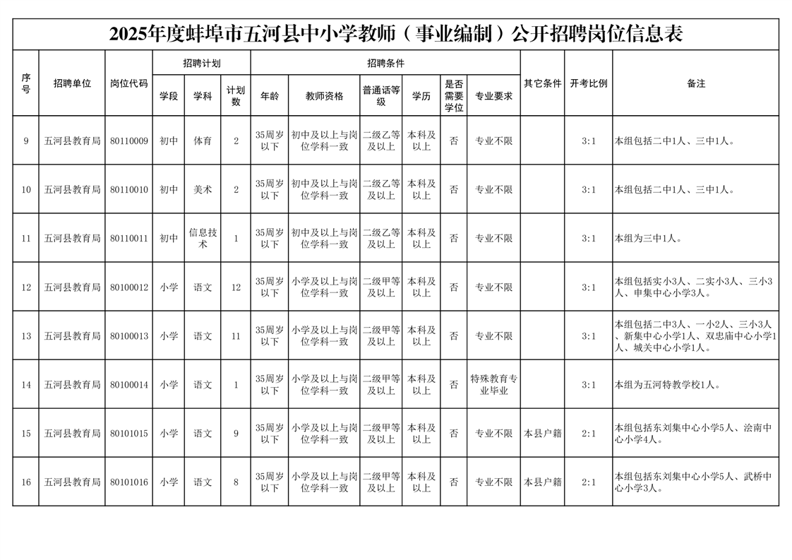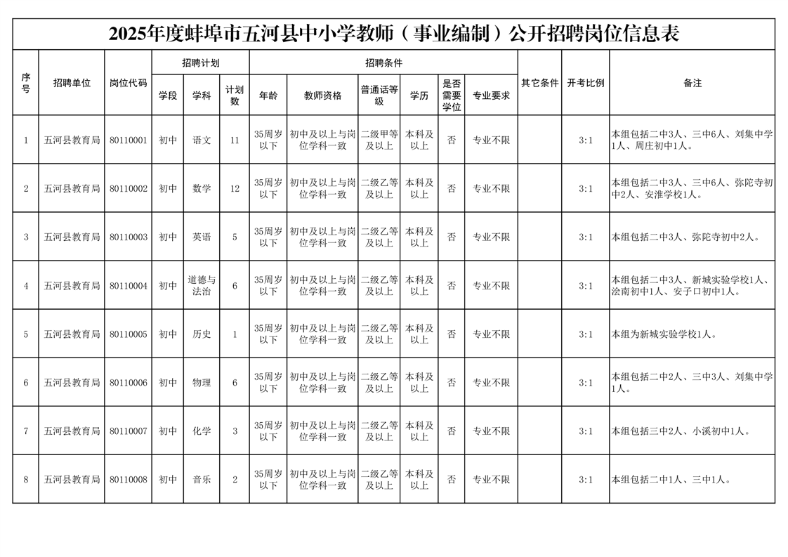 2025年度蚌埠市五河县中小学教师(事业编制)公开招聘岗位信息表