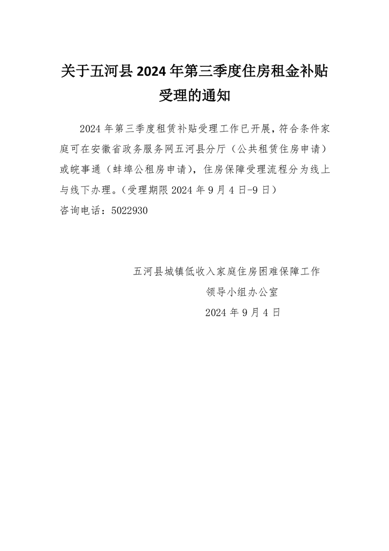 关于五河县2024年第三季度住房租金补贴受理的通知