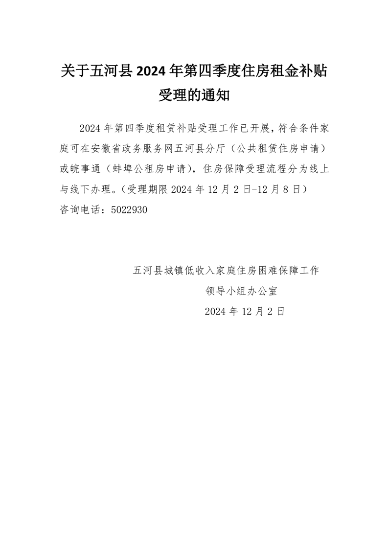 关于五河县2024年第四季度住房租金补贴受理的通知