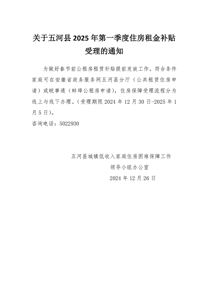 关于五河县2025年第一季度住房租金补贴受理的通知