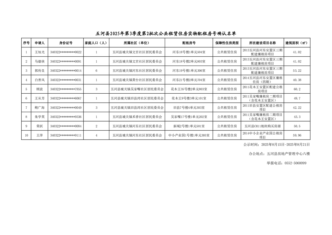 五河县2025年第3季度第2批次公共租赁住房实物配租房号确认名单