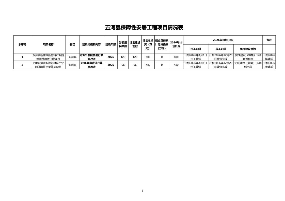 五河县2026年保障性租赁住房项目建设情况表 |