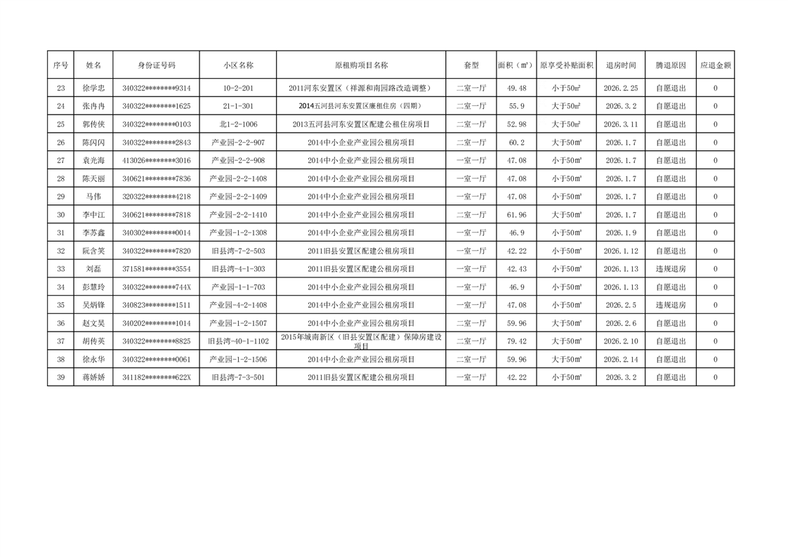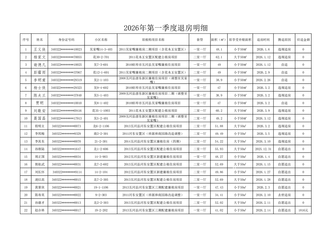 2026年第一季度退房表
